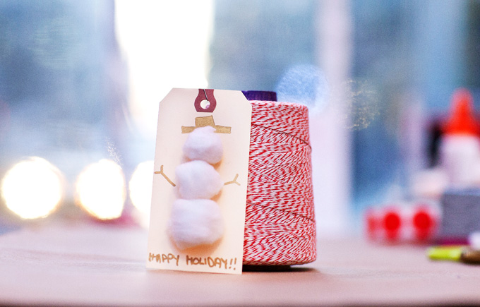 Dab three dots of glue on your tag, and glue down your cotton balls to make the snowman’s body