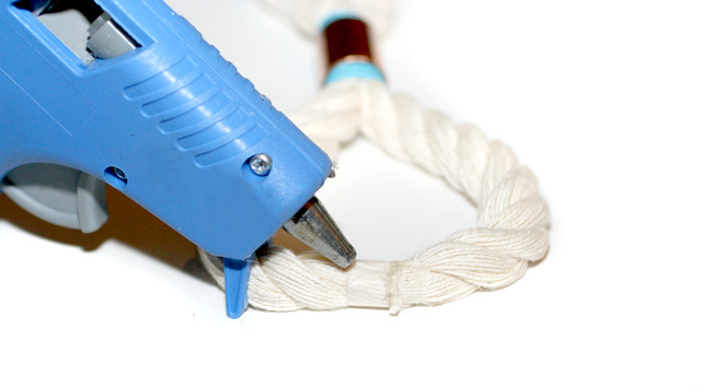 Glue the end to the wrapped rope to secure. Repeat on the other side of the piping.