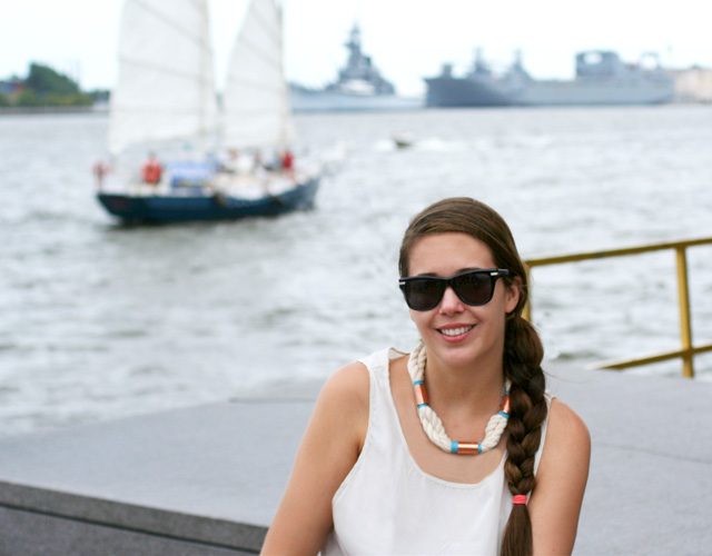 With a tripped planned for Philly this weekend, I wanted to make a nautical inspired necklace fit to wear by water. After wandering the aisles of Home Depot, I found the perfect copper piping pieces to combine with rope to create the look. And finished it off with a pop of blue!
