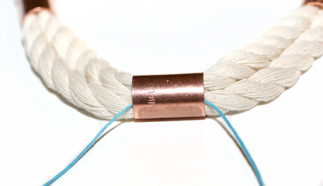 Double up the rope and string the copper piping on it. Space evenly around the rope.