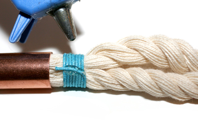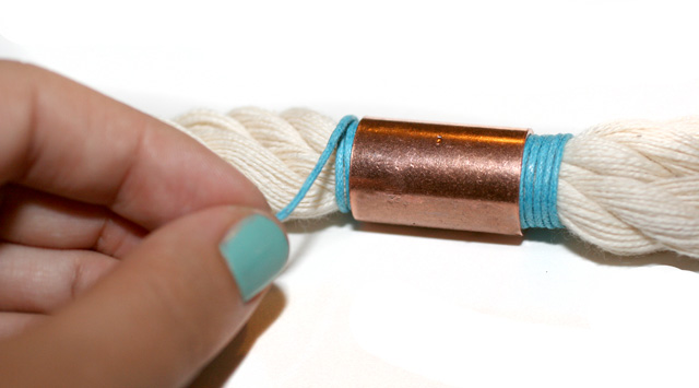 Wrap leather rope on both sides of the copper piping to keep in in place (and add a pop of color!)