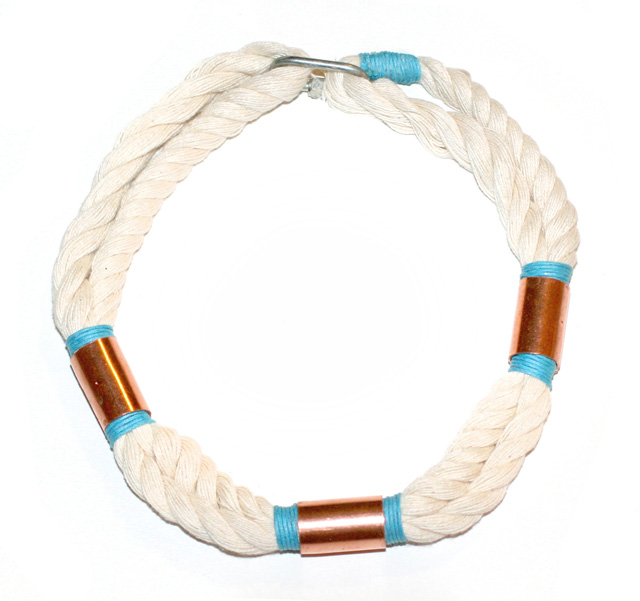 Double up the rope and string the copper piping on it. Space evenly around the rope.